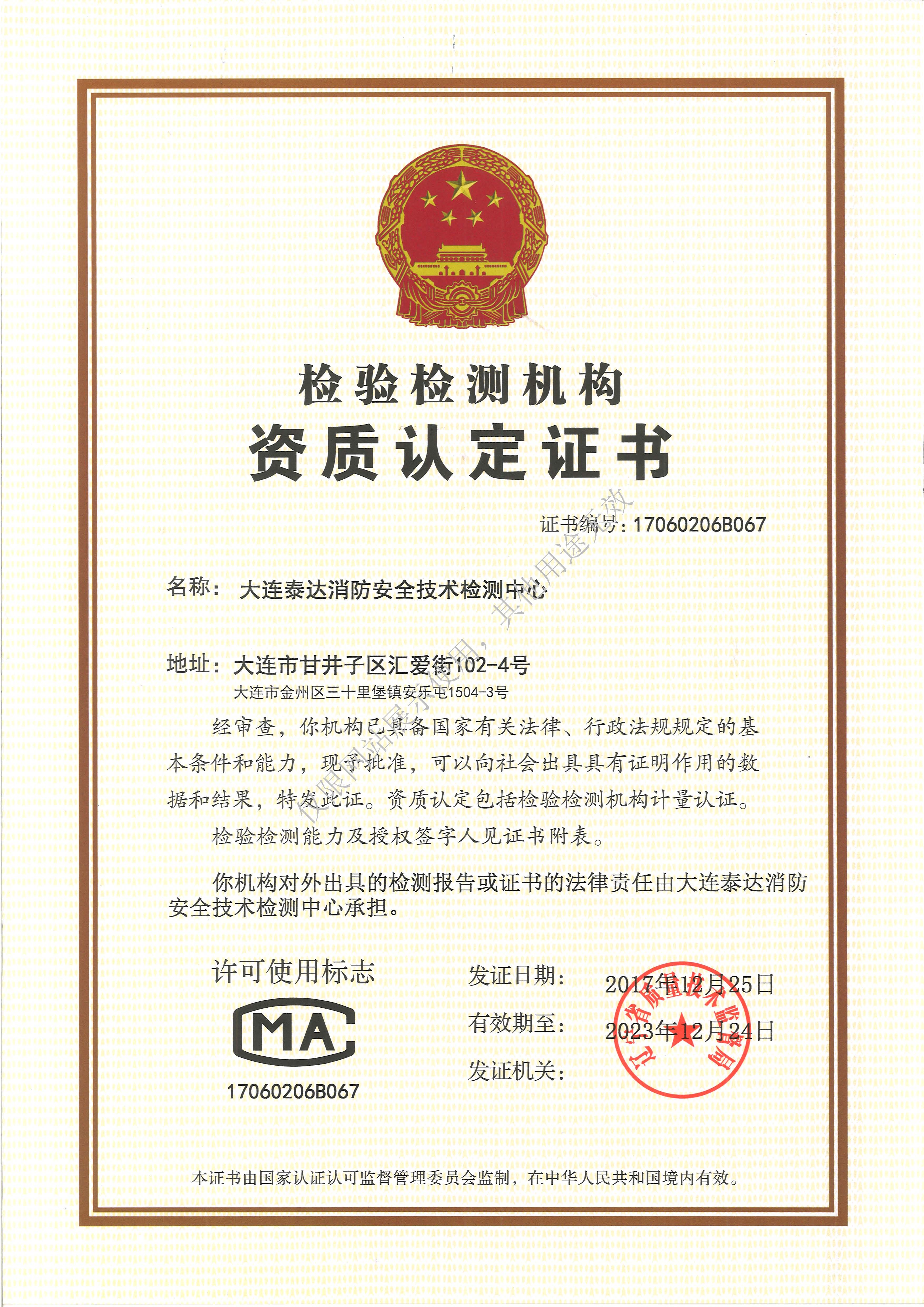 大連泰達消防安全技術檢測中心成立于2003年3月,2004年通過遼寧省質量技術監督局資質認定,成為大連地區首批取得計量認證資質證書的消防檢測機構;